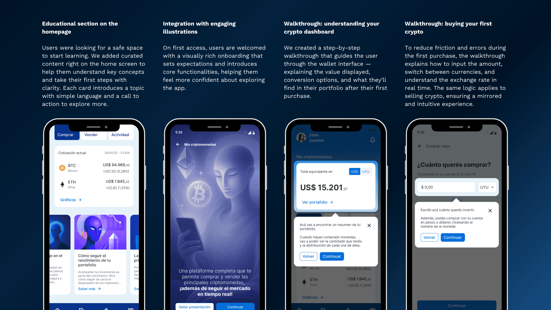 I led end-to-end product design for Banco OCA's cryptocurrency wallet, targeting 300,000 traditional banking customers in Uruguay who showed crypto curiosity but feared market entry. Through comprehensive user research with 58 participants, I discovered that 80% had heard of crypto but never transacted due to trust and knowledge barriers. My solution focused on education-first onboarding and seamless account integration, achieving 100% task completion in usability testing and 4.8/5 user satisfaction. The MVP was approved by executive leadership and positioned OCA as Uruguay's first traditional bank to offer integrated crypto services.