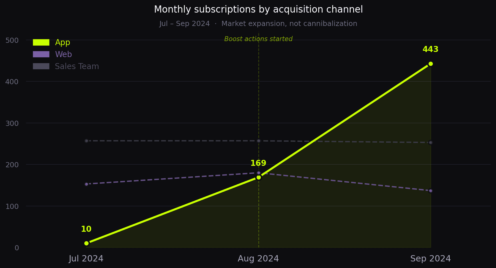 A product with an 85% customer value score, validated by internal research with real users, was generating only 48 subscriptions in its first weeks on mobile, against 145 from the web platform. The product wasn't the problem, discoverability was. In 8 weeks, through behavioral data analysis, cross-squad negotiation, and three targeted design interventions, the mobile channel went from last place to #1 acquisition channel, reaching 443 monthly subscriptions in September, surpassing both the web platform and specialist recommendations, and contributing to nearly R$7M in managed portfolios without cannibalizing existing channels.