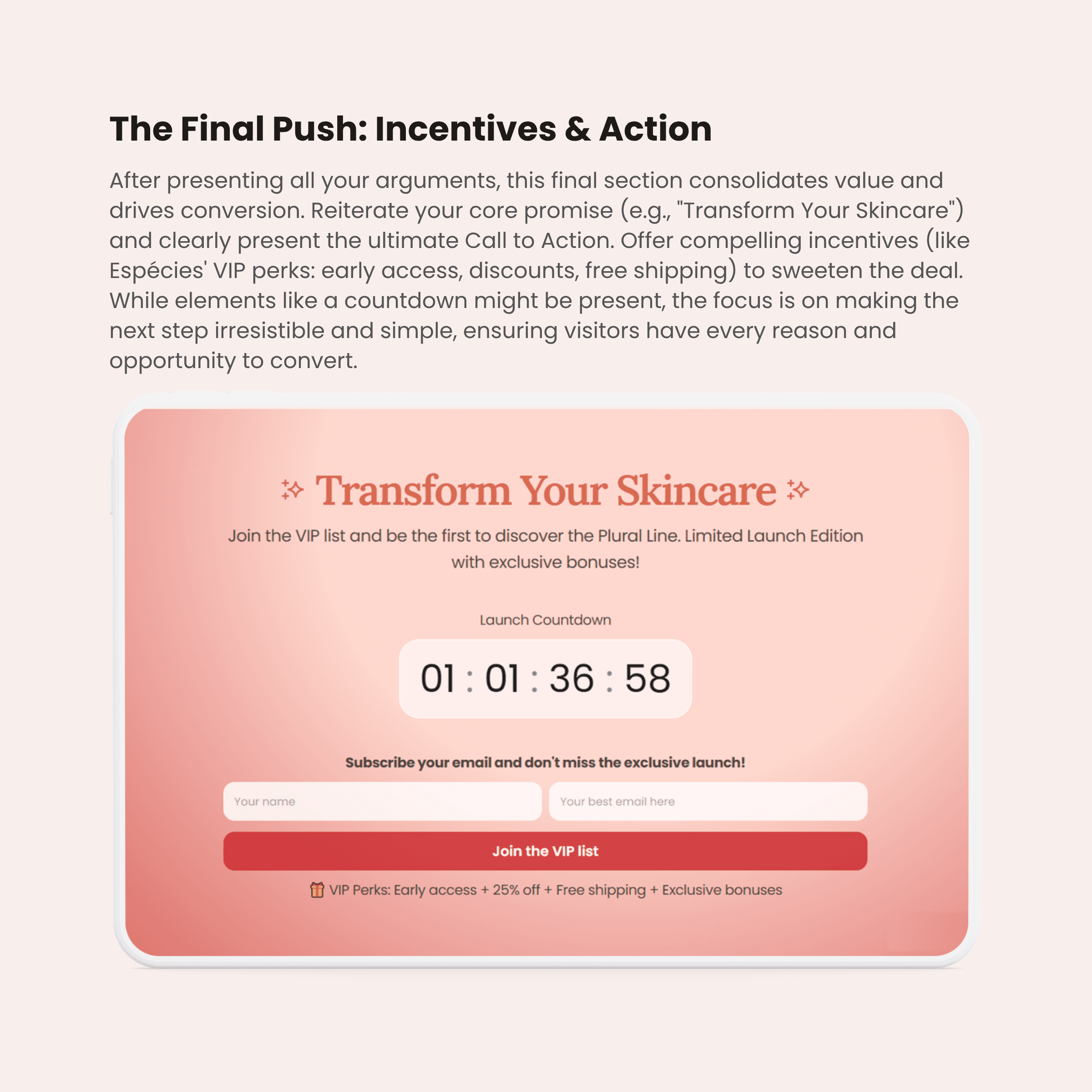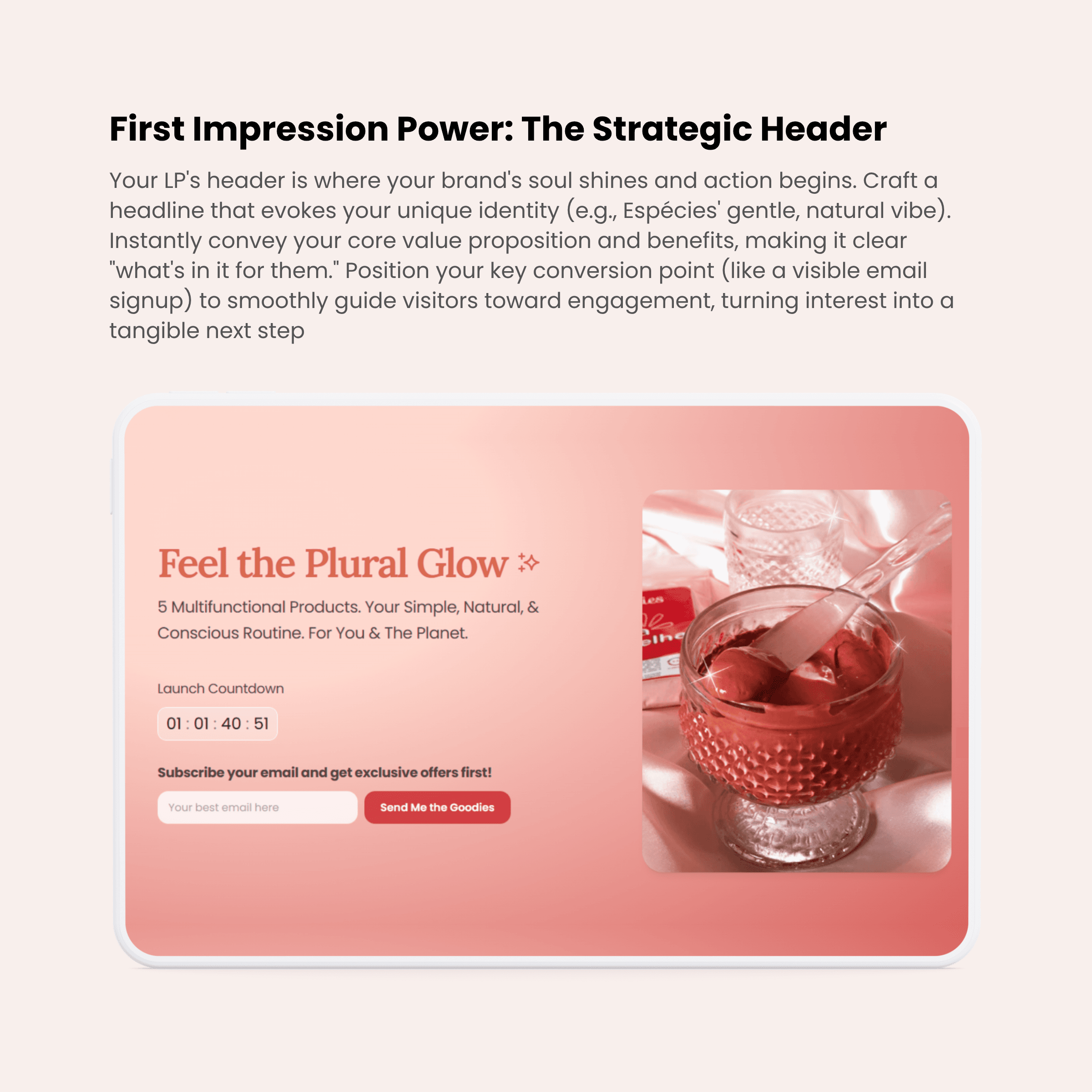 Irresistible Hook & Immediate Value: The LP would open with a compelling "Feel the Plural Glow" and a dynamic Countdown Timer to create urgency, immediately inviting users to subscribe for exclusive offers. This sets a singular conversion focus and highlights immediate user benefits.