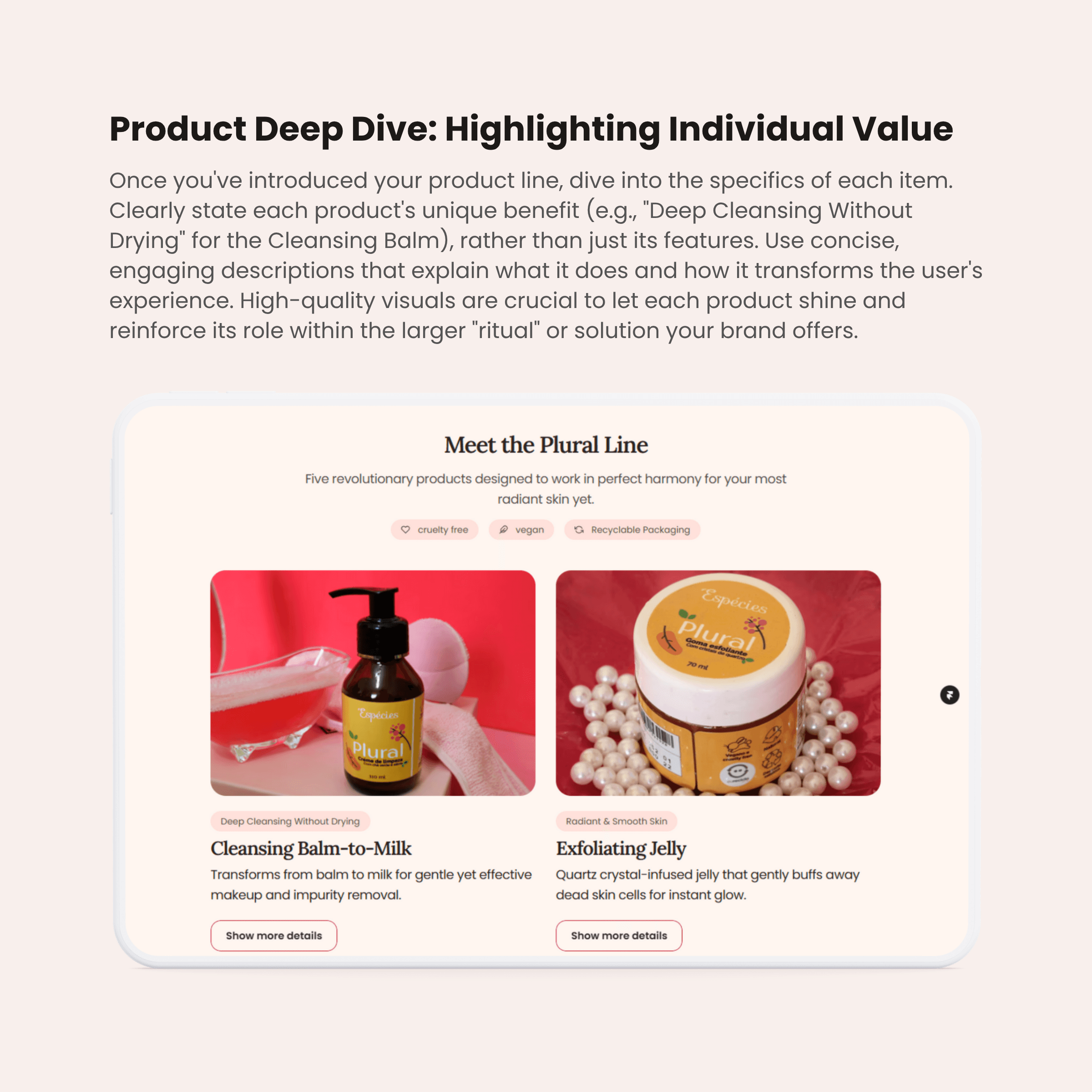 The Founder's Dilemma I Actually Lived: During Espécies' active years (2017-2021), I faced a frustrating limitation that many small business owners know well: being trapped by rigid e-commerce templates that couldn't capture our brand's authentic, gentle aesthetic. Our Plural Line—5 multifunctional products designed to be "gentle on your skin and the world"—deserved a launch experience that matched its thoughtful formulation.