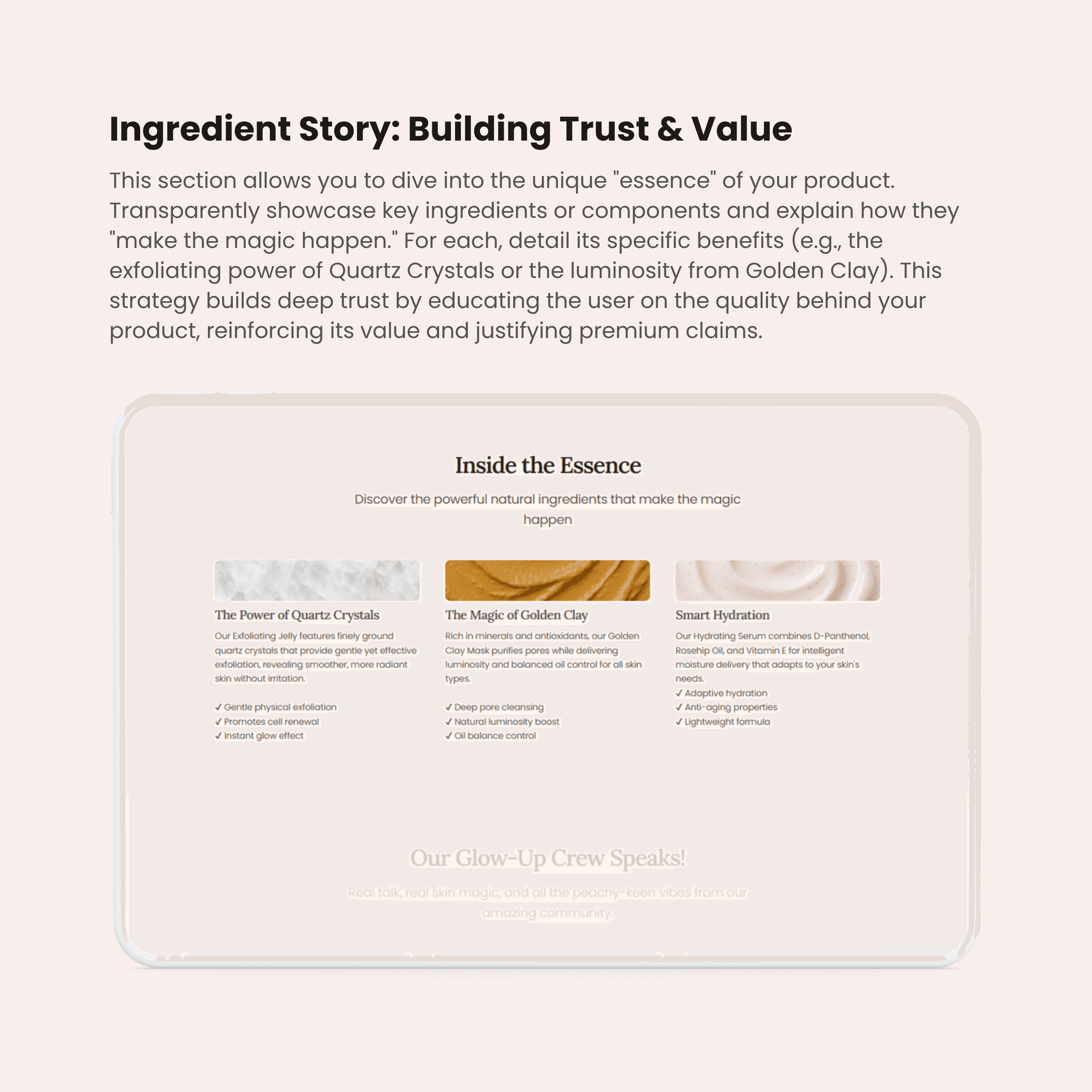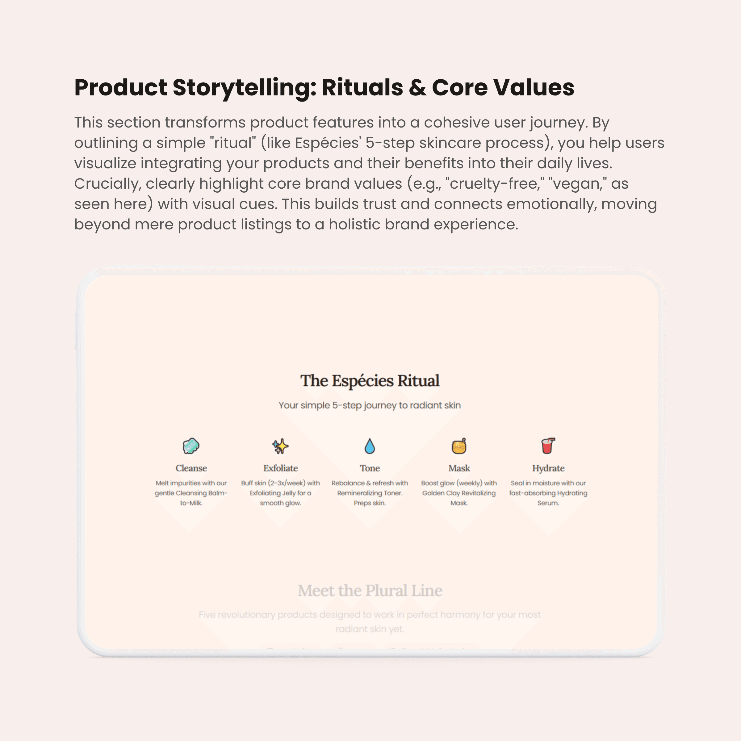 Benefit-Driven Narrative & Social Proof: Instead of just listing features, the "Espécies Ritual" details a 5-step routine, highlighting tangible user benefits. The "Meet the Plural Line" showcases product impact, complemented by "cruelty-free," "vegan," and "recyclable" icons. Crucially, "Our Glow-Up Crew" testimonials build vital trust and social proof.